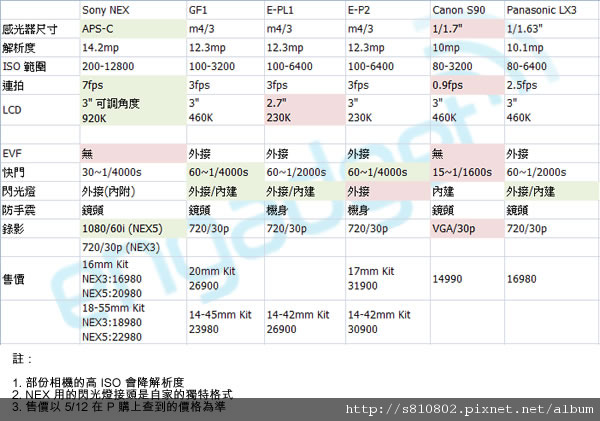 3.受到Sony Nex最大衝擊的是Ricoh GRD系列、Olympus E-Pen系列與準專業相機(Prosumer),至於GF1,筆者認為與Nex-3與Nex-5相比則是更高一階的機種,但畫質、操控與價格相對均衡,反而所受衝擊較小(使用E接環則是野心更大,但筆者的感想太過大膽,所以就不寫出)